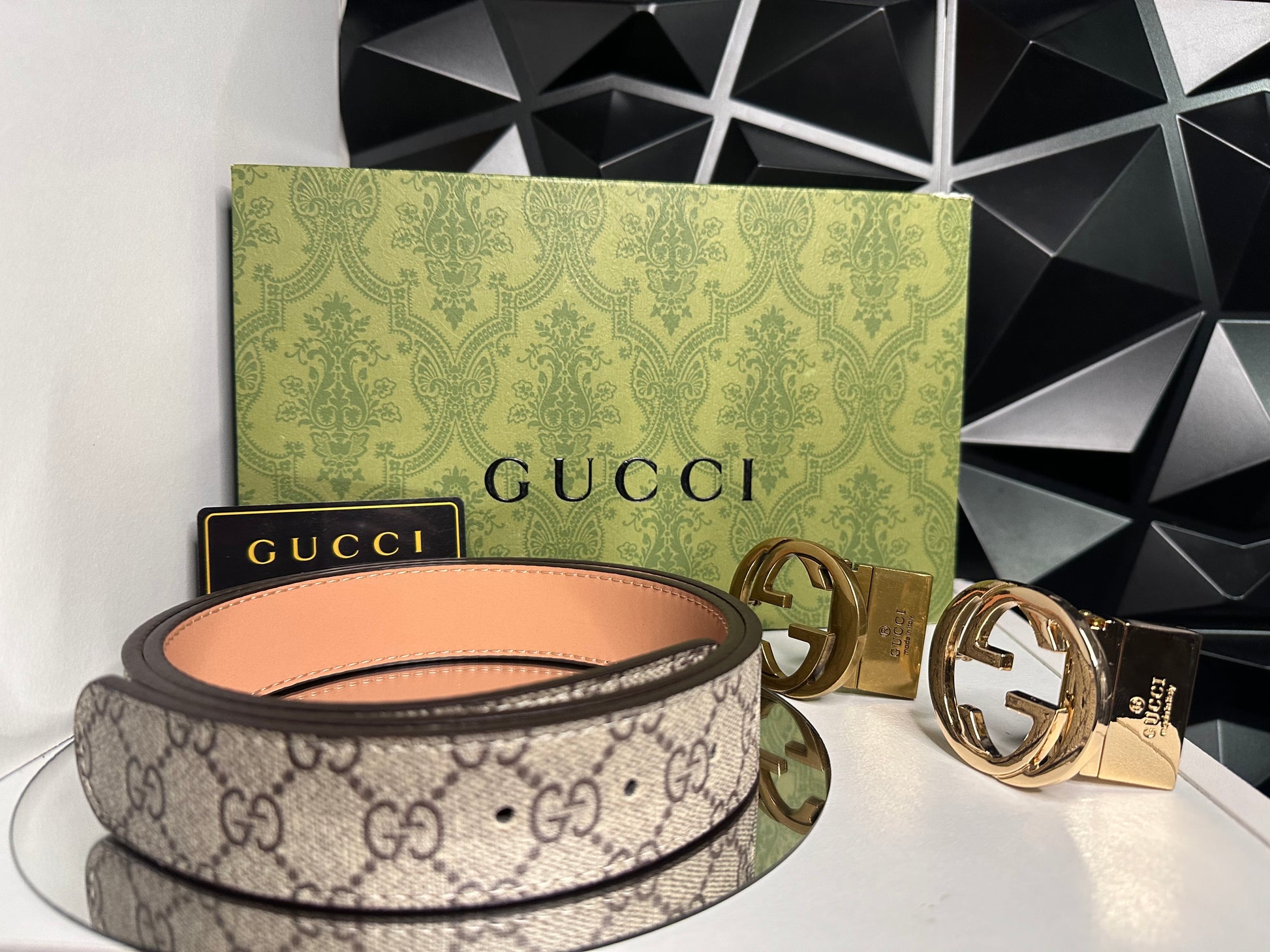 Correa reversible con dos hebillas. Viene en su caja.
