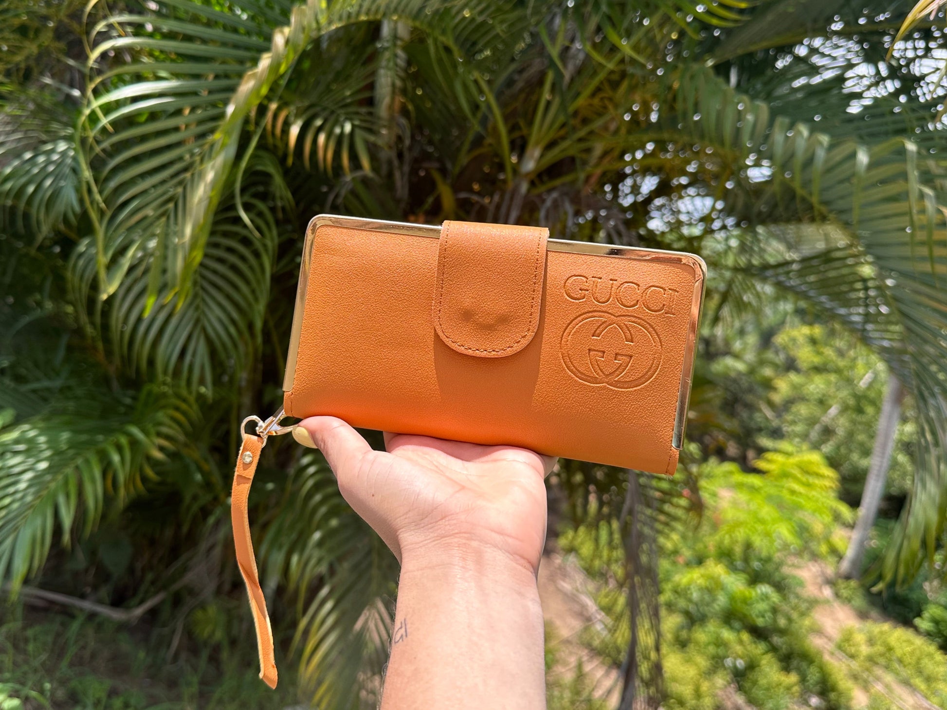 Wallet con espacio para tarjetas, billetes y celular. Incluye correa para asegurar en la muñeca.