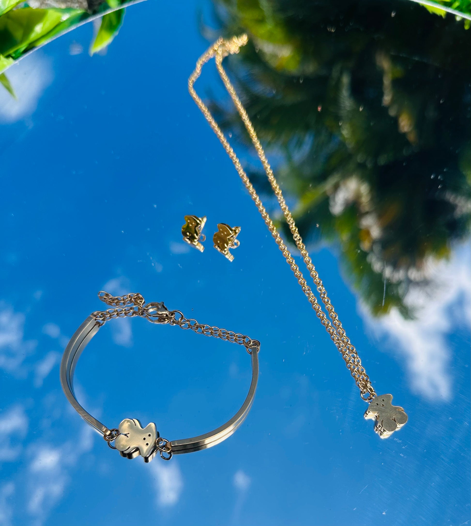 Set en stainless steel. Incluye pantallas, collar y pulsera.
